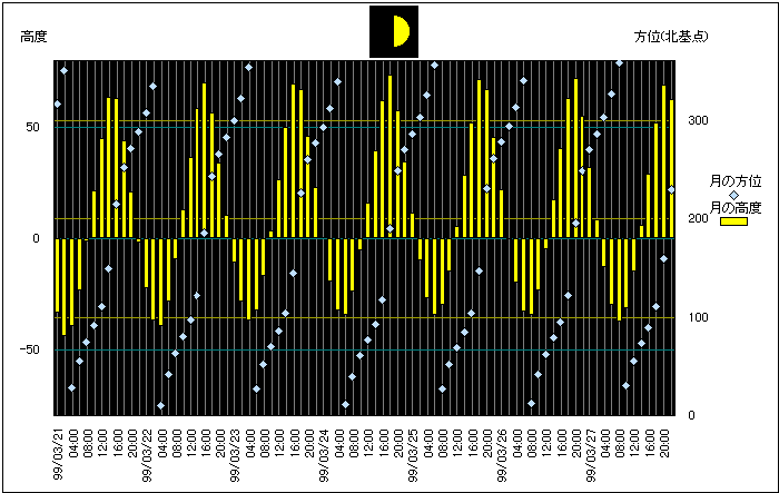 ![]() | 任意日時で月齢や月と太陽の位置や距離を算出します。 | |