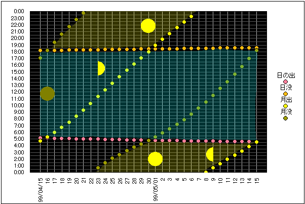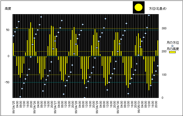 ![]() | 任意日時で月齢や月と太陽の位置や距離を算出します。 | |