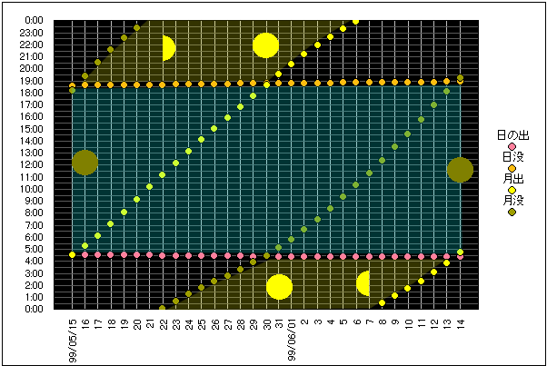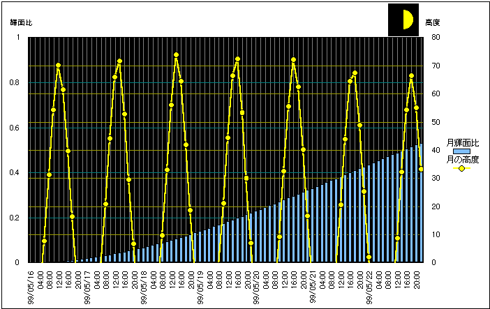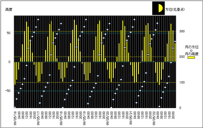 ![]() | 任意日時で月齢や月と太陽の位置や距離を算出します。 | |