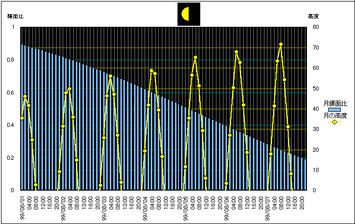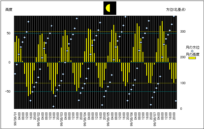 ![]() | 任意日時で月齢や月と太陽の位置や距離を算出します。 | |