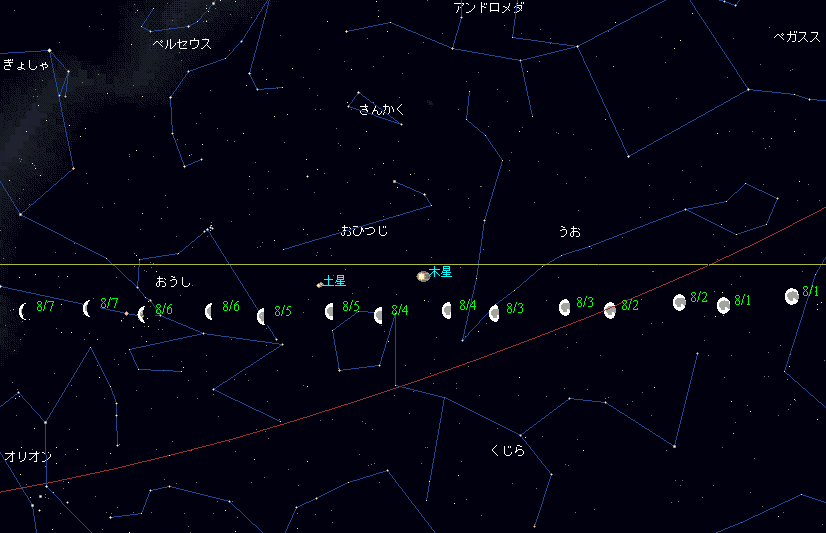下弦の月(02:27) 土星が月の北2゜54′に接近(10:28) |