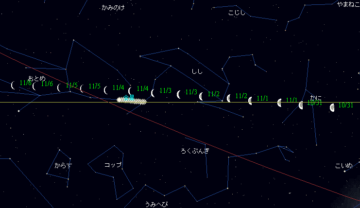 ![]() ![]() ![]() | 月が獅子座 レグルスの北1゜22′に接近(12:47) |